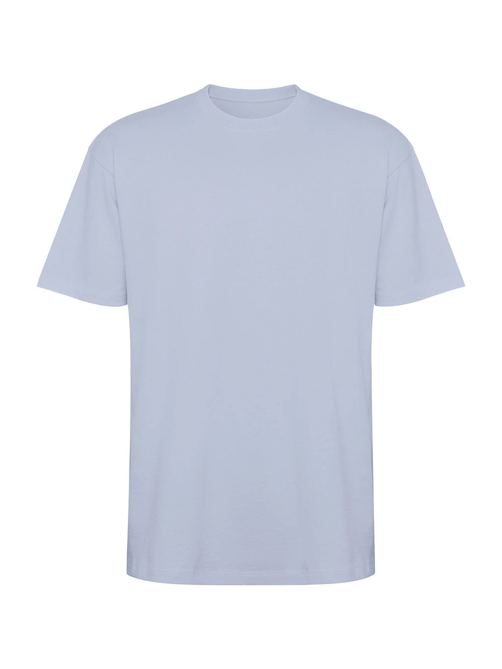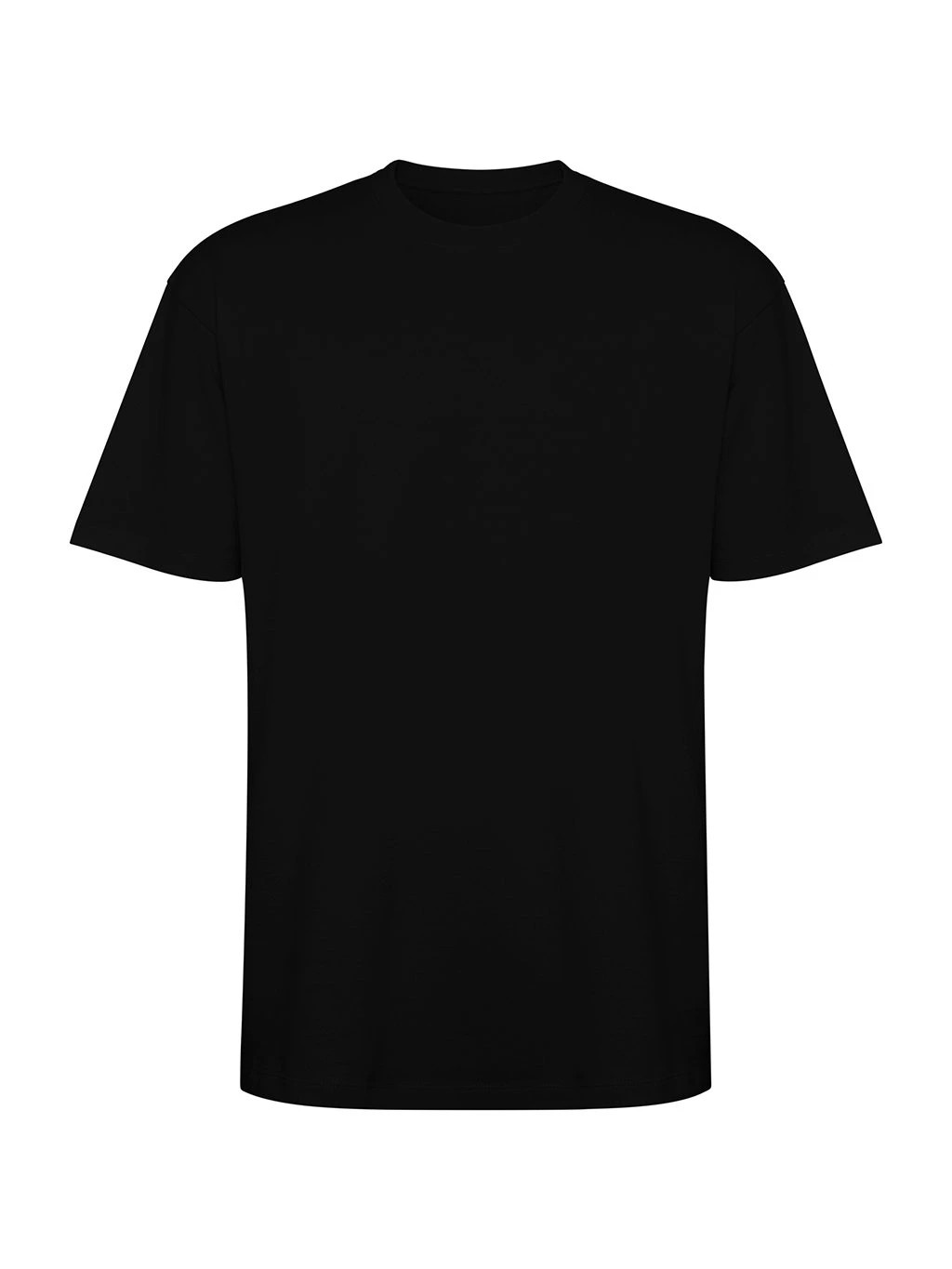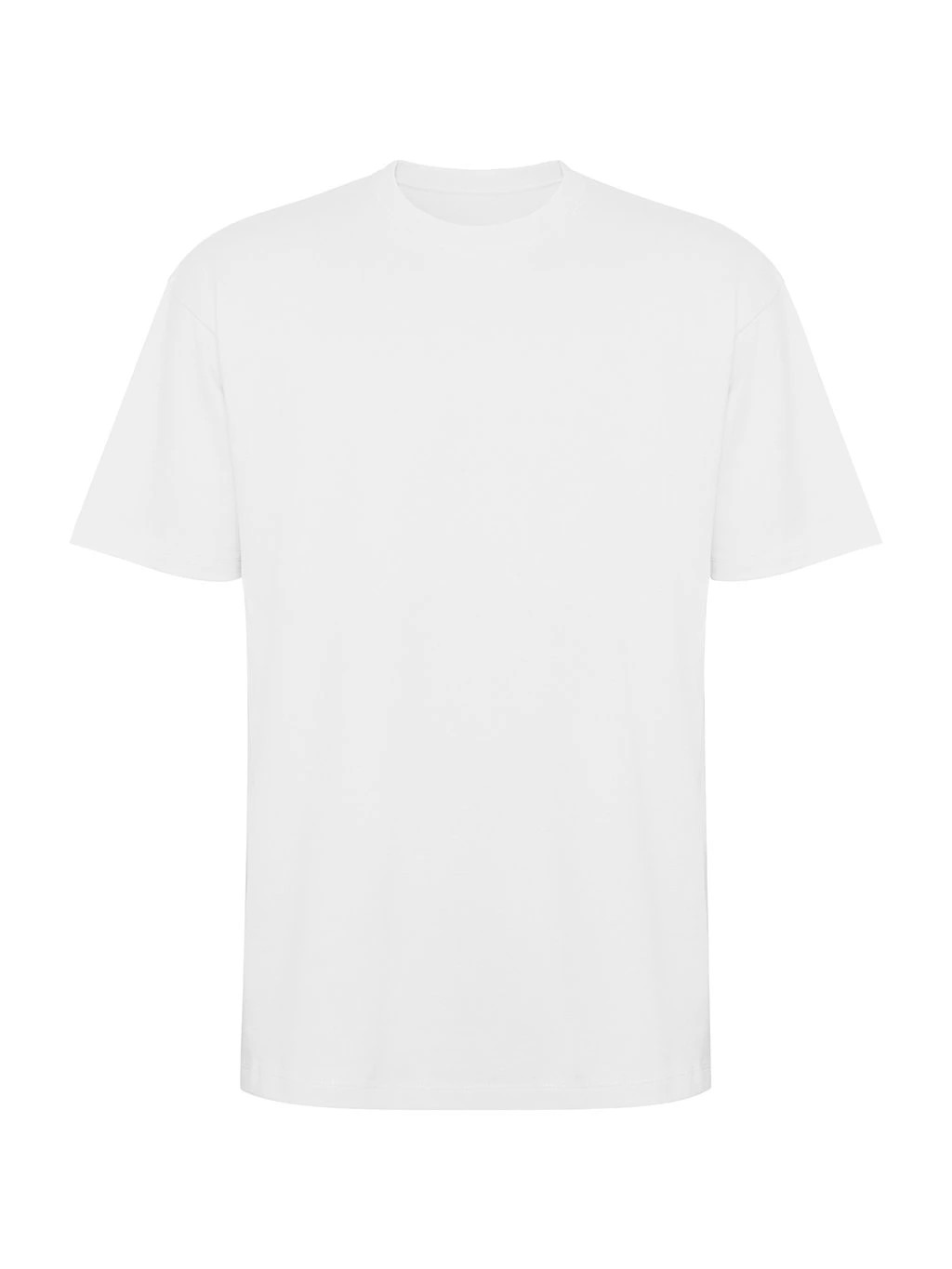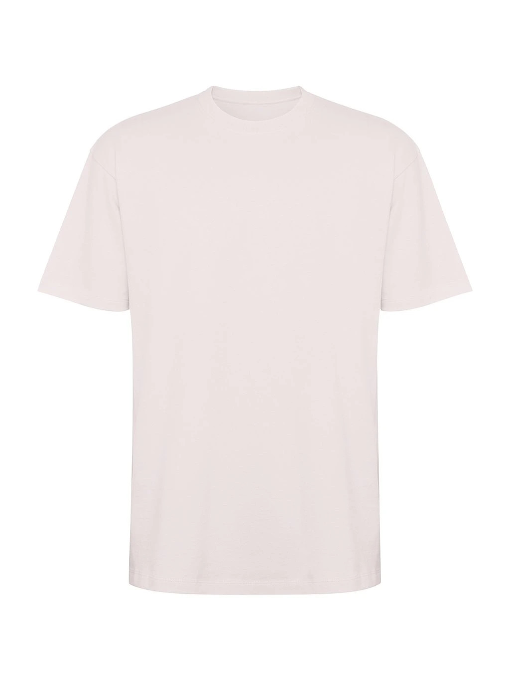 Tričko s krátkým rukávem v nadměrné velikosti. Okrouhlý límec lemovaný 2x1 žebrováním s odpovídajícími kryty švů. Boční švy. Široké dvojité prošití na rukávech a spodním lemu.