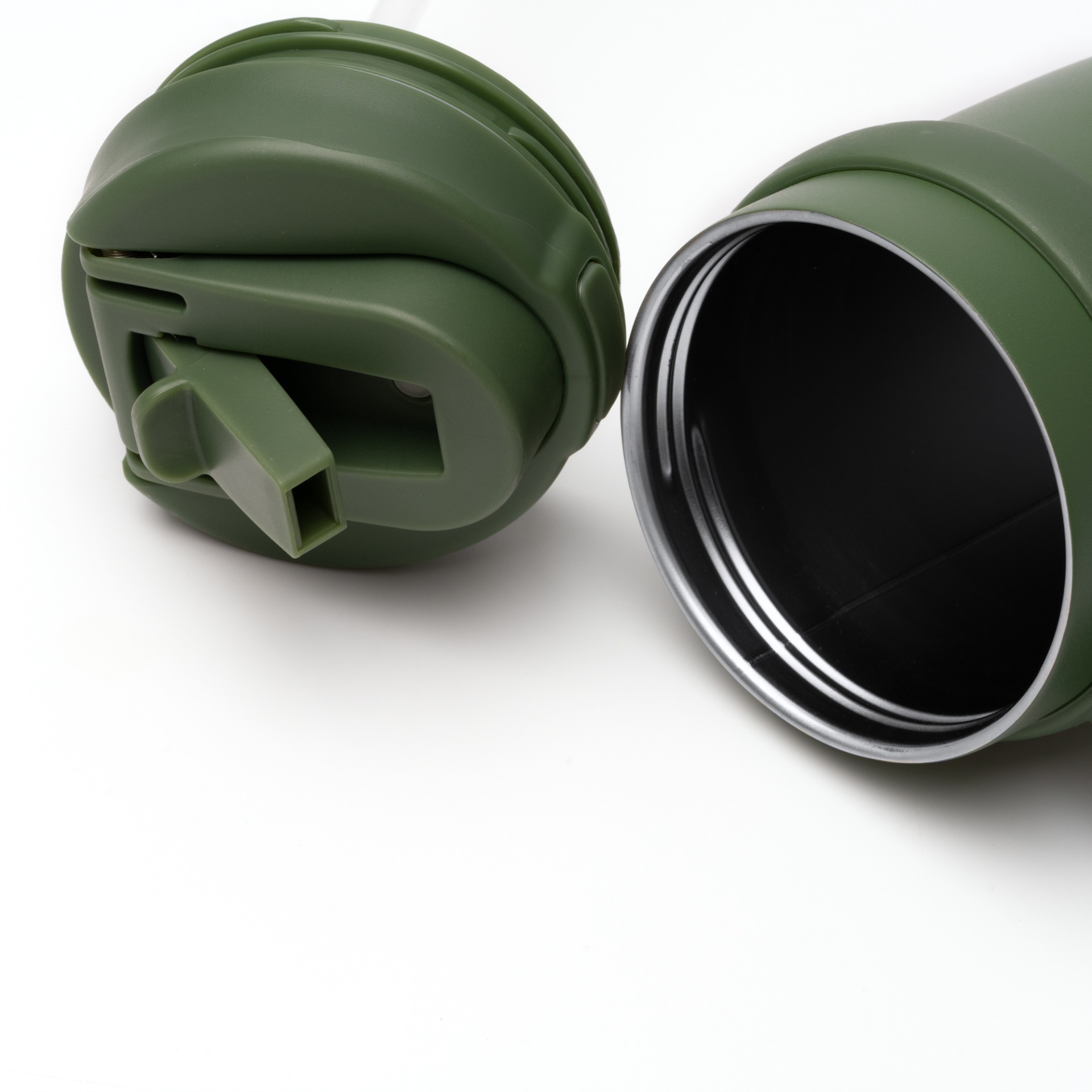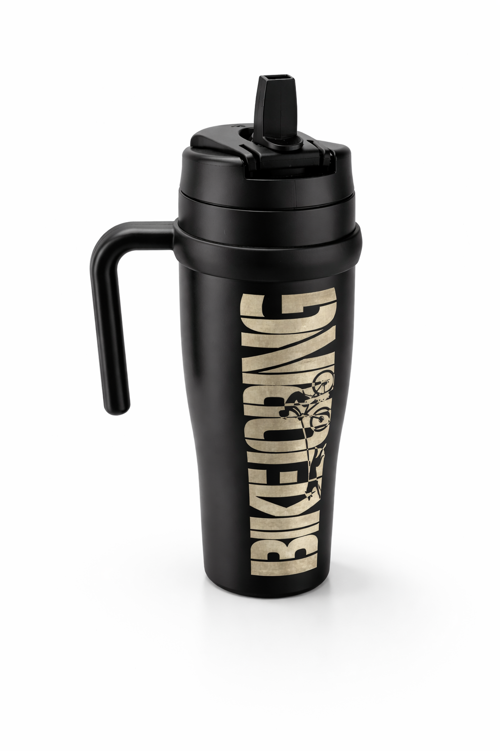 Dvoustěnný termo hrnek z nerezové oceli 304. Těsnící šroubovací uzávěr a praktické víčko s tlačítkovým otevíráním. Široká rukojeť ve stejné barvě zajišťuje pohodlné používání. Díky zúženému dnu je hrnek ideální na cestování autem, hrnek dokonale padne do držáků auta.