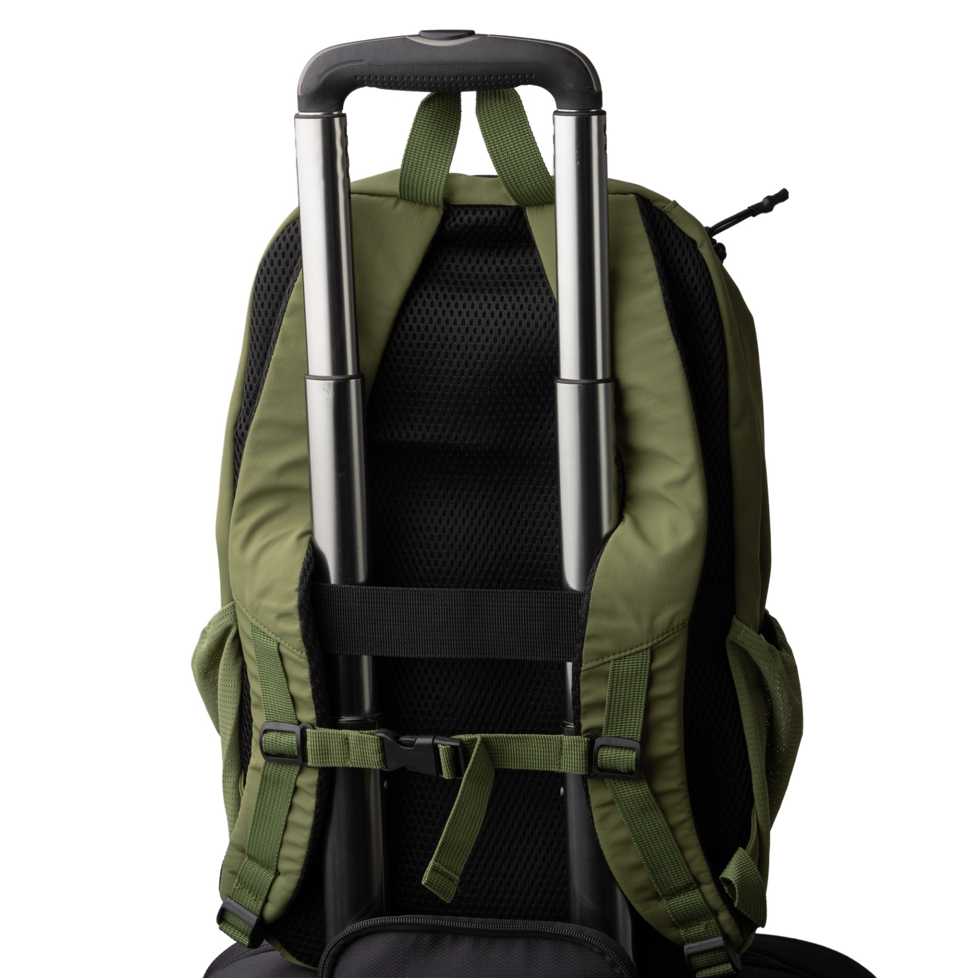 Sportovně laděný batoh vyrobený z nylonu 280D Tanslon. Hlavní přihrádka s polstrovanou kapsou na notebooky do 15" a malou kapsou na zip. Dvě přední kapsy na zip a dvě sladěné boční síťované kapsy na lahve. Polstrovaná záda a ramenní popruhy. Popruh pro přidělání batohu ke kufru na kolečkách. Objem: 14 l.