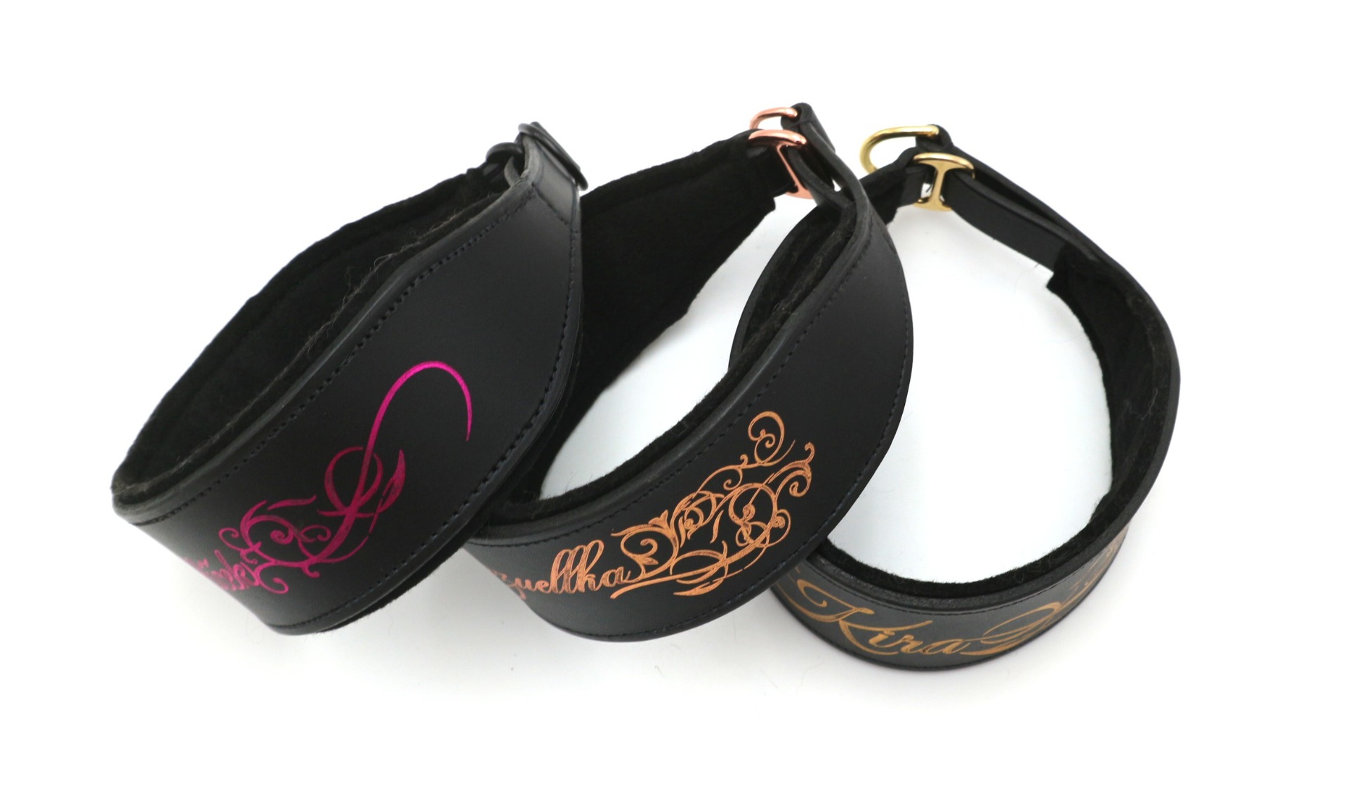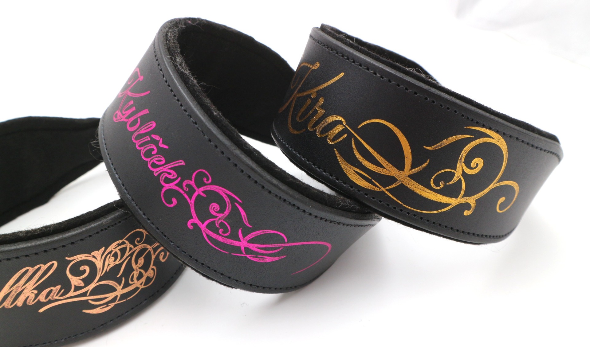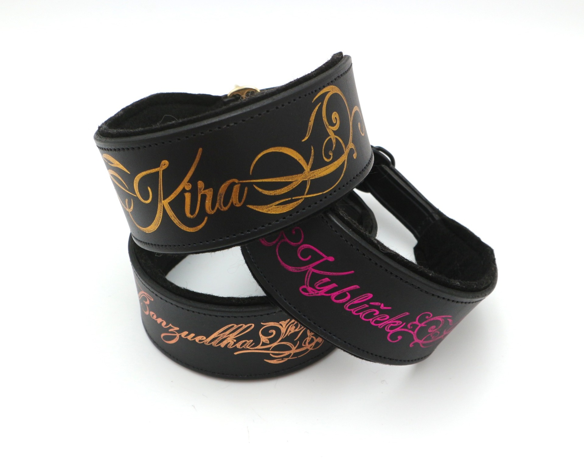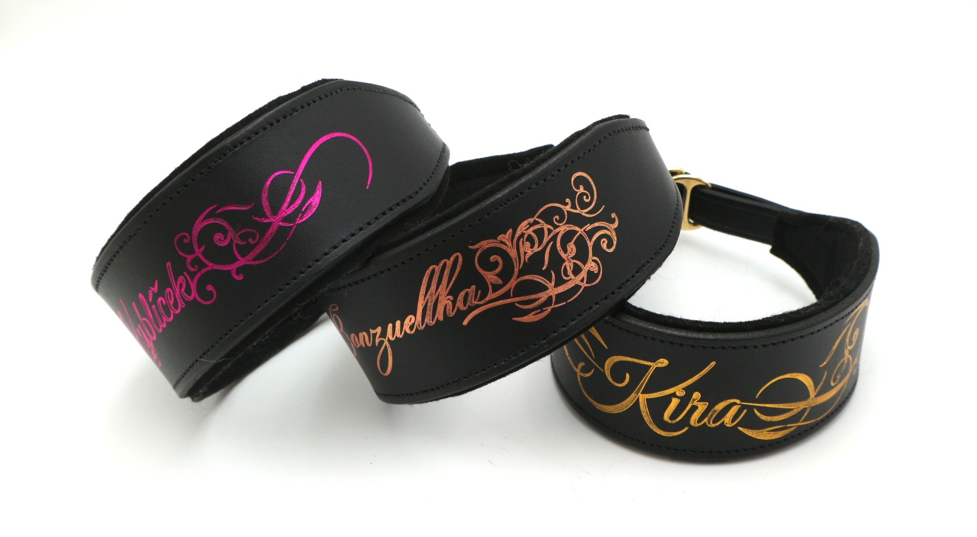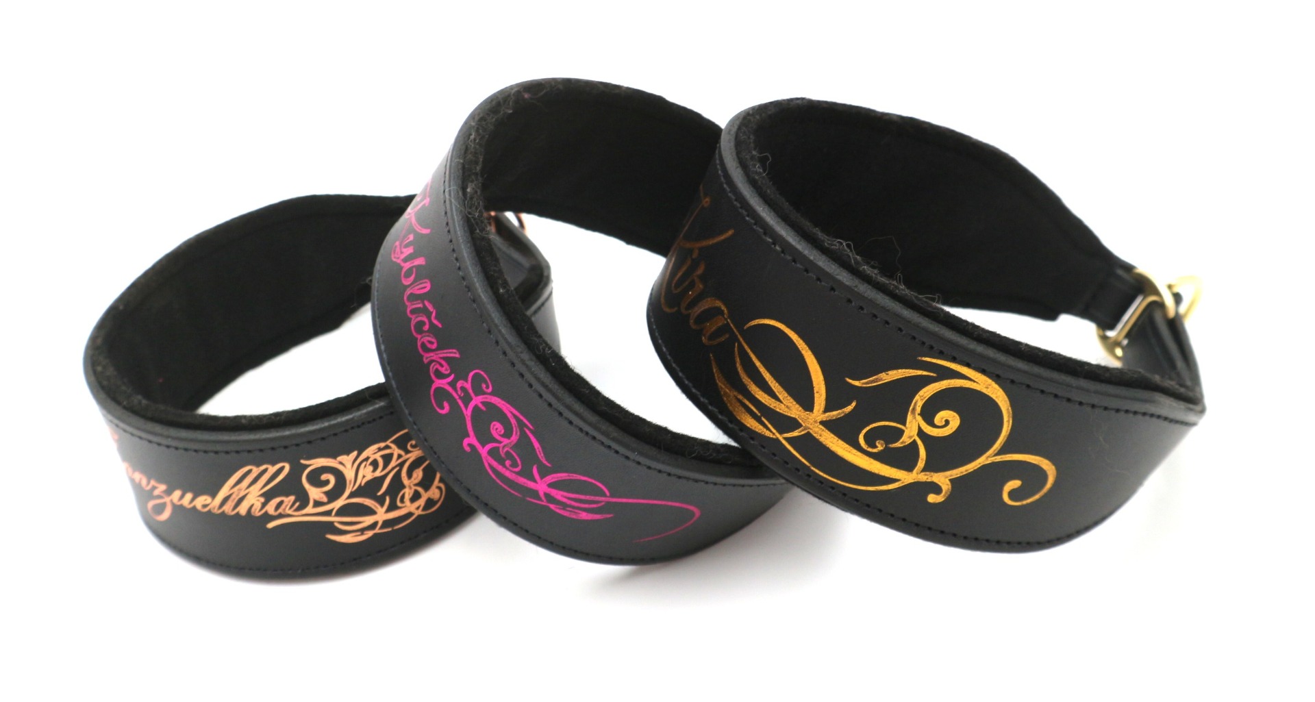 Zlacení na obojku vytváří originální design, který zaujme na první pohled. Jako motiv je možné vybrat jméno psa, ornament, geometrické vzory, logo chovatelské stanice. Případné návrhy na motiv nahrajte do formuláře pod produktem. Do poznámek můžete napsat jméno psa a svou představu o motivu.