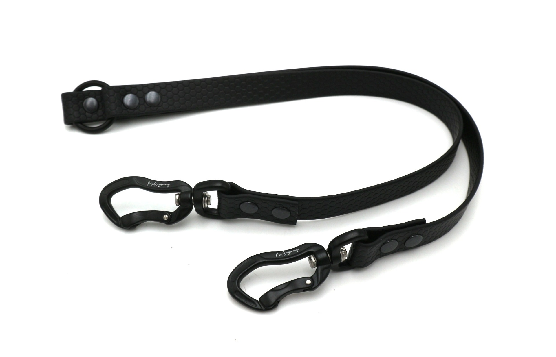 Vysoce odolné vodítko přepínací je vyrobeno z voděodolného popruhu HEXA (známý jako BioThane®). BioThane® hexa je speciální povrch, který má oboustrannou strukturu ve tvaru včelí plástve (Hexa vzor) a je potažený PVC/TPU materiálem - díky tomu méně prokluzuje a je příjemný na dotyk. Popruh vyniká odolností vůči oděru a vytahování. Dále nepohlcuje pachy ani plísně a je jednoduše omyvatelný vodou.