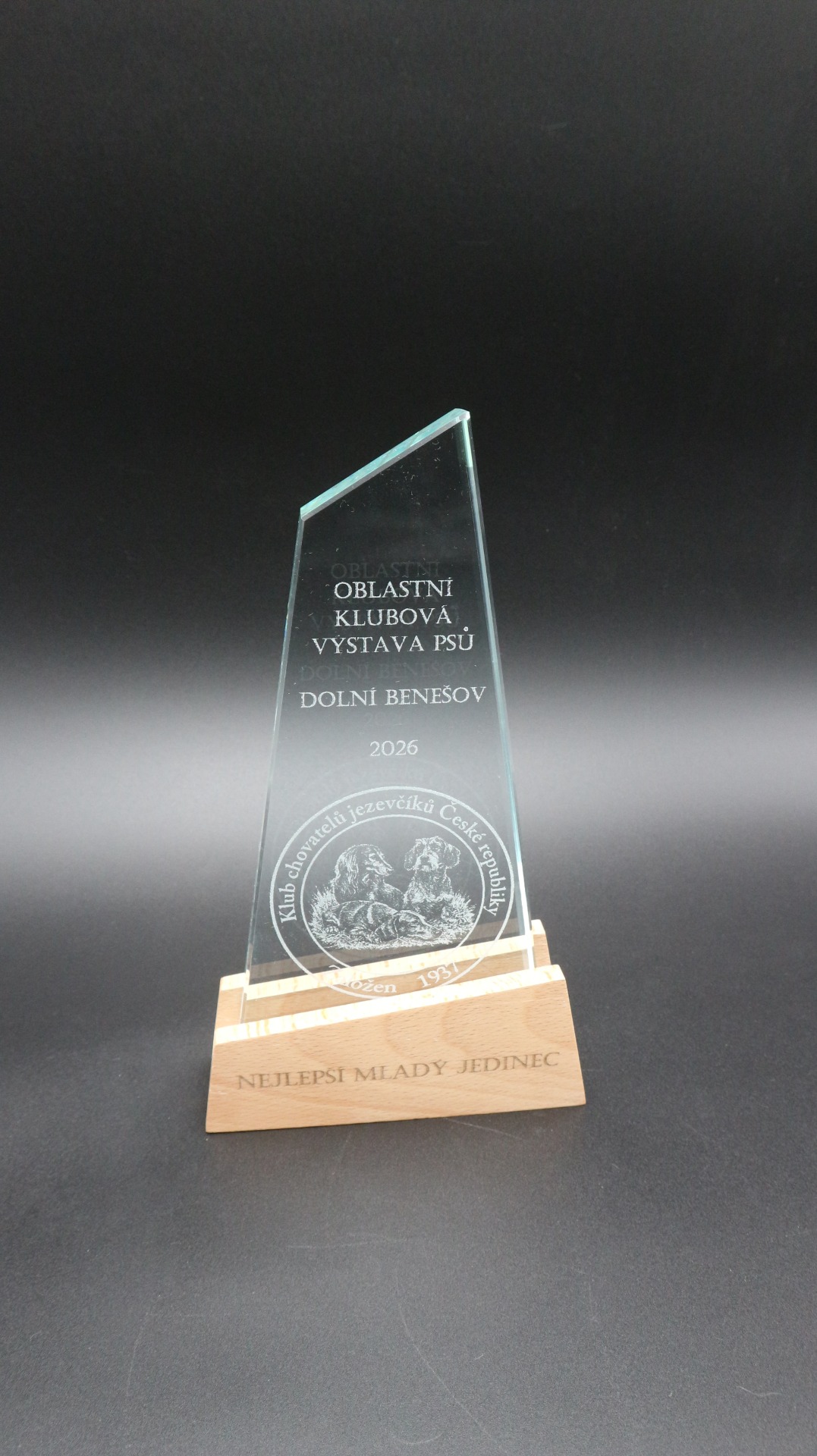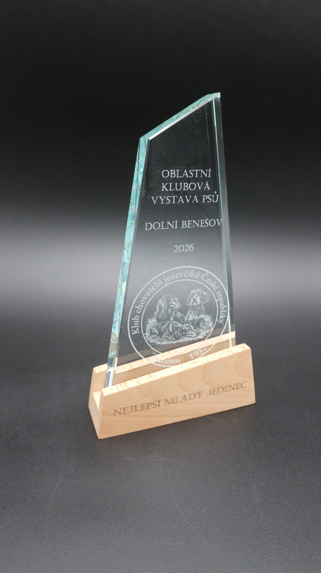 Skleněná trofej ve skosené designu a bambusový podstavec. Včetně kraftového prezentačního pouzdra.