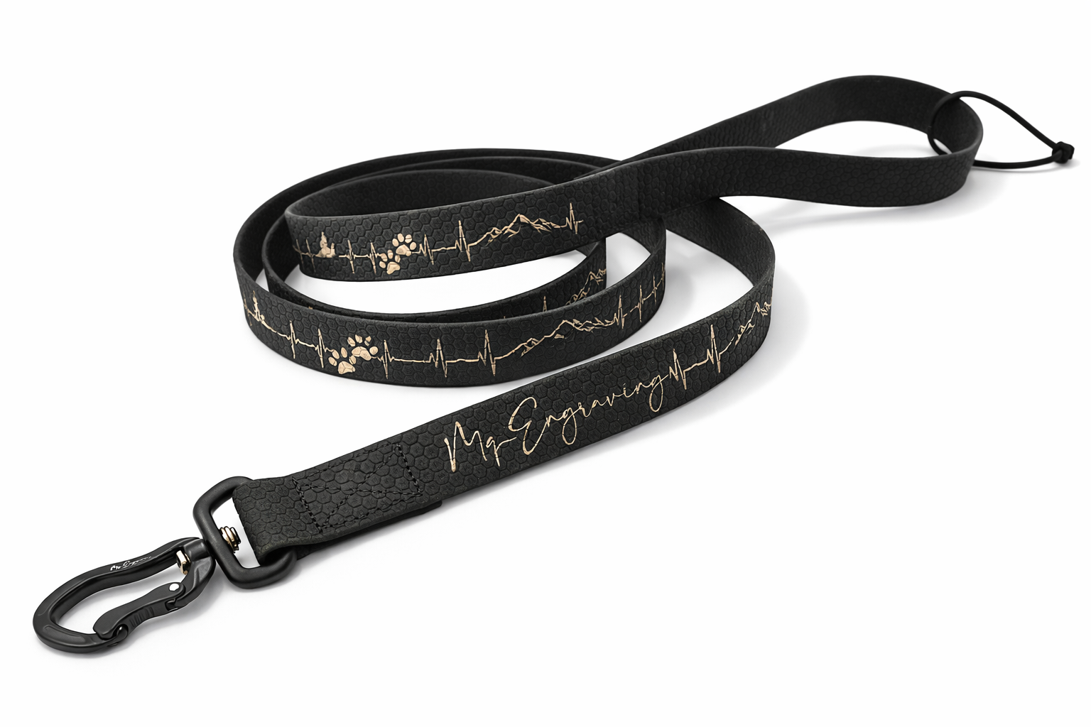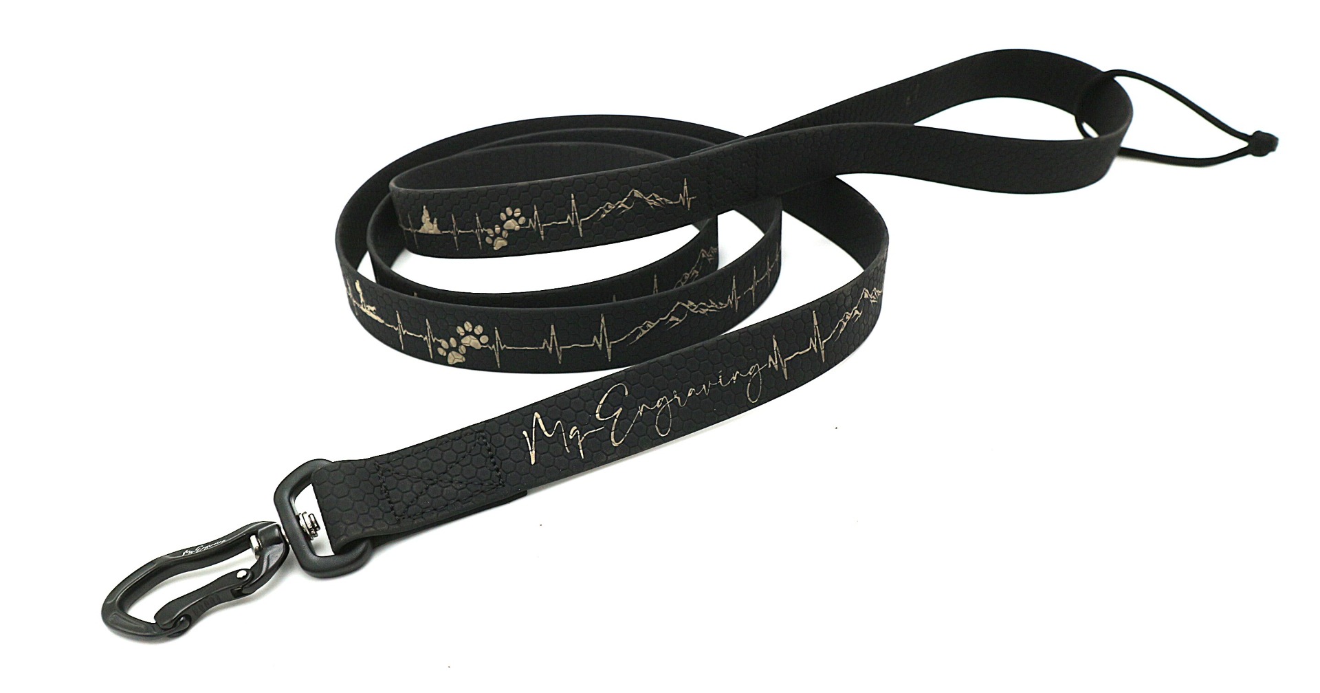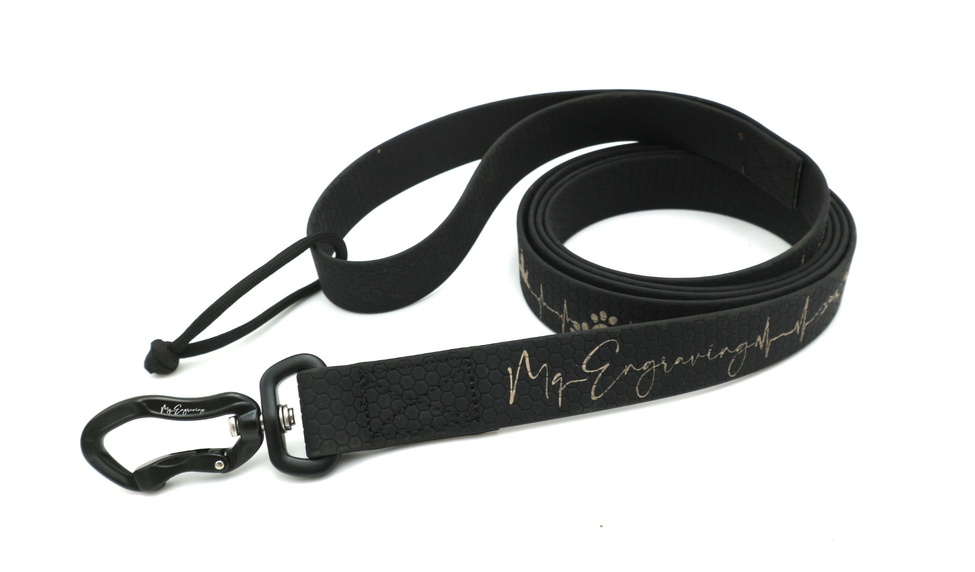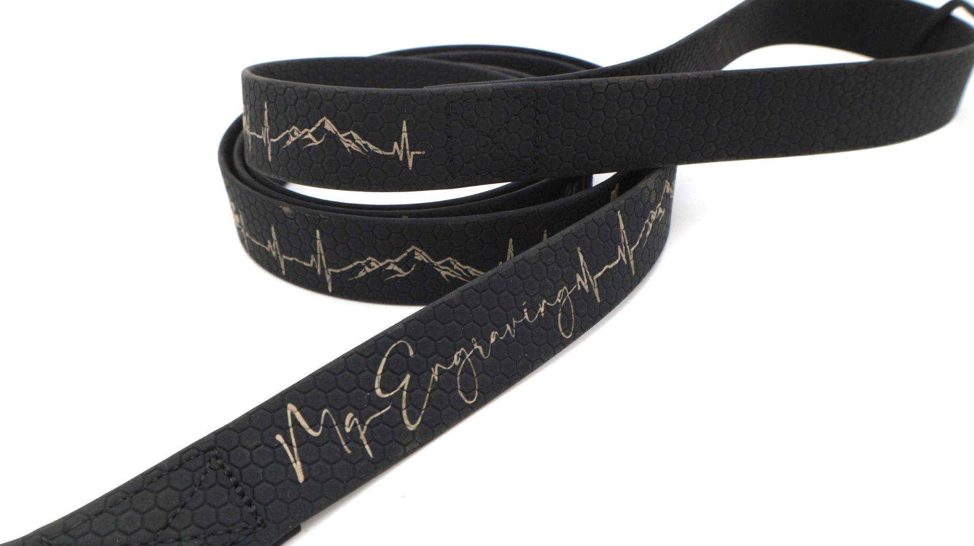Vysoce odolné vodítko HEXA s gravírovaným motivem, je vyrobeno z voděodolného popruhu (známý jako BioThane® ). Jedná se o popruh, který je potažený PVC materiálem. Oproti běžným polypropylenovým popruhům se vyznačuje mnohem větší odolností. Popruh vyniká odolností vůči oděru a vytahování. Dále nepohlcuje pachy ani plísně a je jednoduše omyvatelný vodou. Popruh má oboustrannou strukturu ve tvaru včelí plástve (Hexa vzor), díky strukturovanému povrchu, méně prokluzuje a je příjemné na dotyk.